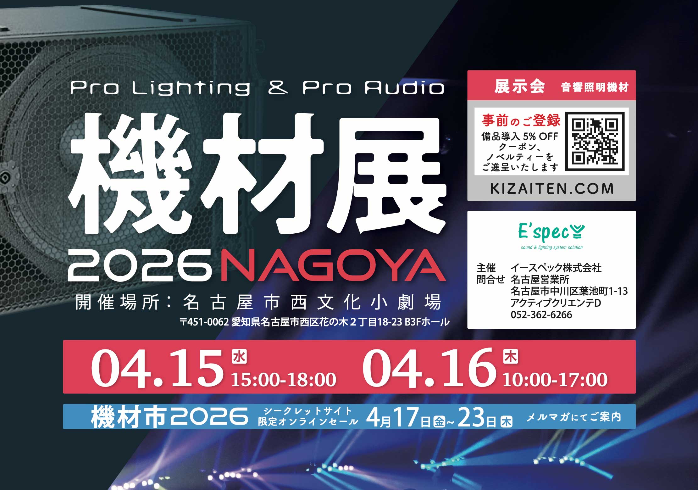 この度、イースペック株式会社は、2026年4月15日(水)~16日(木)に名古屋市西文化小劇場 B3Fホールにて音響照明機器の展示会、機材展2026 NAGOYAを開催させていただきます。