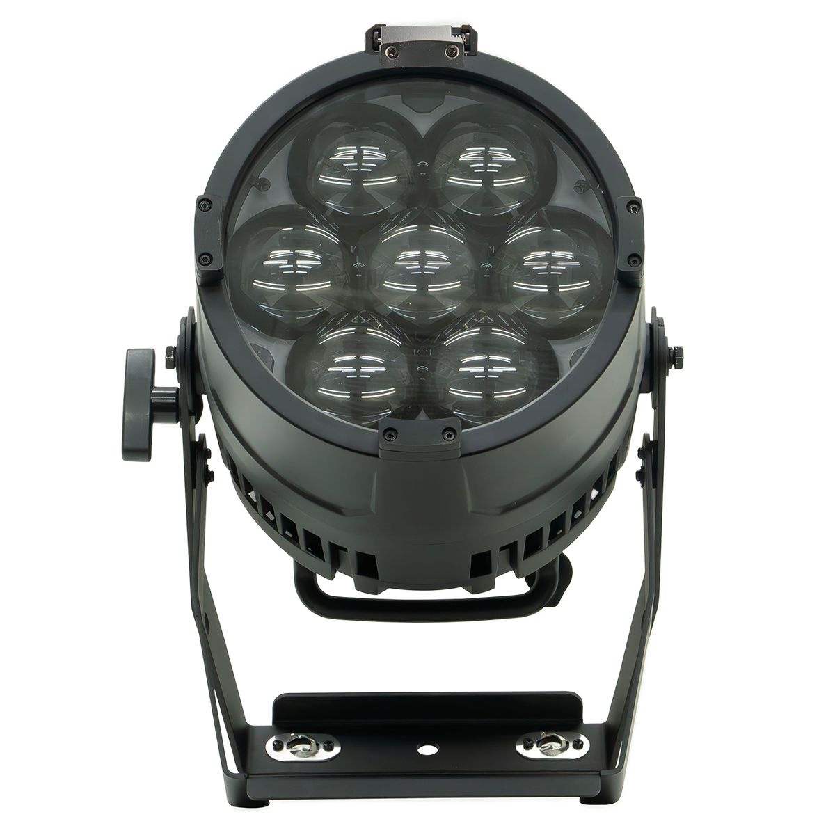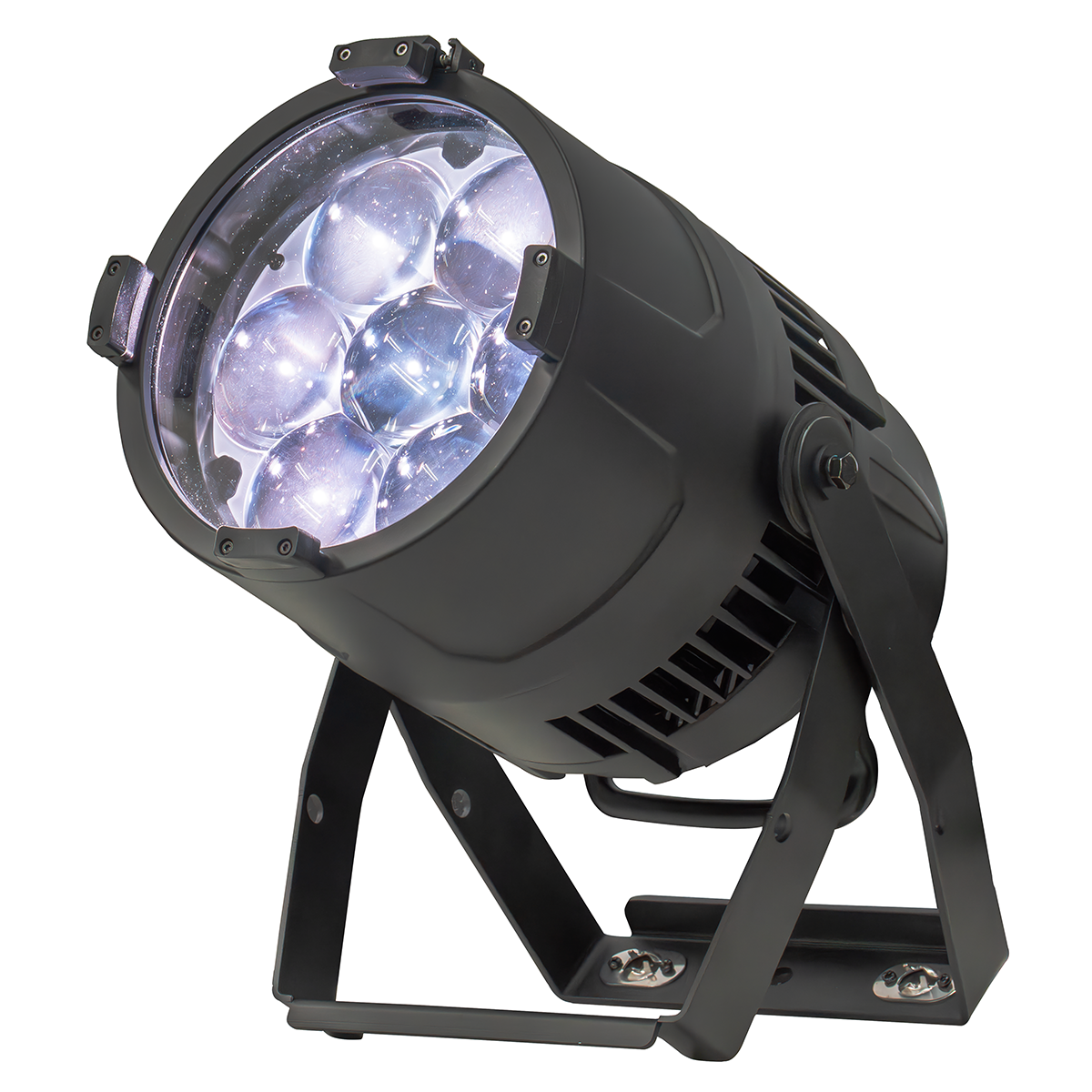 E-LITE STAGE「DAZ-PAR7」は、オリジナルなデザインと光学レンズ、制御技術を結集した、次世代の防滴対応ズーム付きLEDパーライトです。7 x 80Wの高出力RGBL LED光源を搭載し、優れた演色性と豊かなカラーレンダリングを実現。従来のRGBW光源では再現が難しかった深みのあるイエローや暖色も、より自然で鮮やかに表現します。