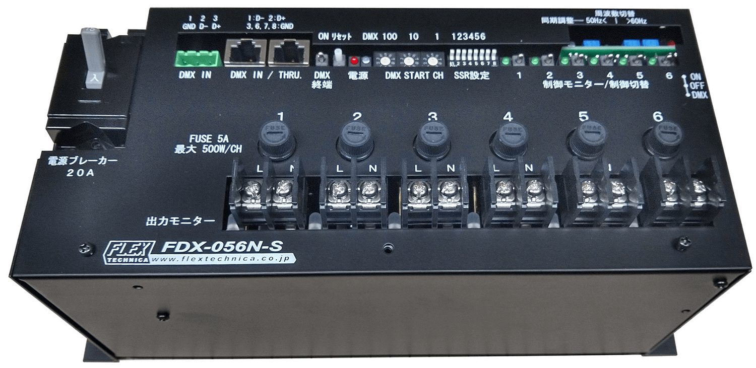 FLEX TECHNICA「FDX-056N-S」は、コンパクトなオールinワンタイプの調光器です。電源を用意すればDMX 入力5A×6ch の調光が出来ます。調光装置の小容量回路向けに、少し回路数が足りないとき、総合演出制御盤での調光装置としてそのたあらゆる場面でお使いいただけます。
