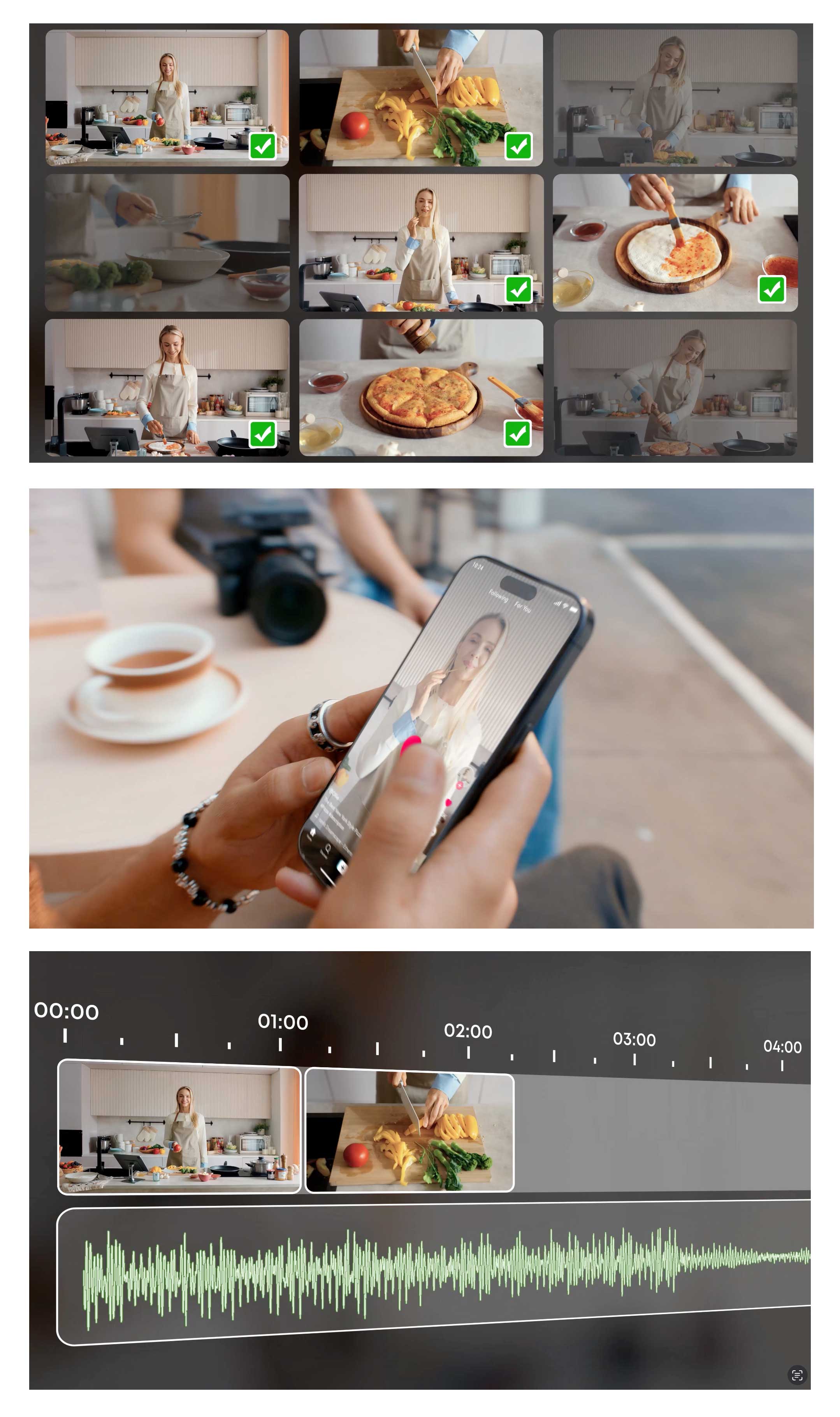 クリップはモバイル編集ソフトウェアに簡単に取り込んで手早く整理できます。分割画面による映像比較のほか、お気に入りに手軽にマーキングしたり、自動ソート機能でカテゴリ別のフォルダにクリップを分類したりできます。検索時間を節約でき、クリエイティブな作業に時間を当てることができます。
